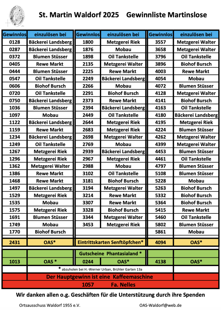 Im angehängten Dokument finden Sie die Nummern der Gewinnerlose aus dem Losverkauf zum St. Martinsumzug 2025 in Waldorf.