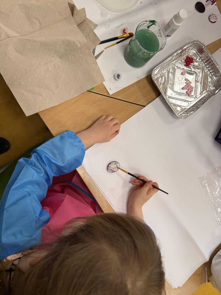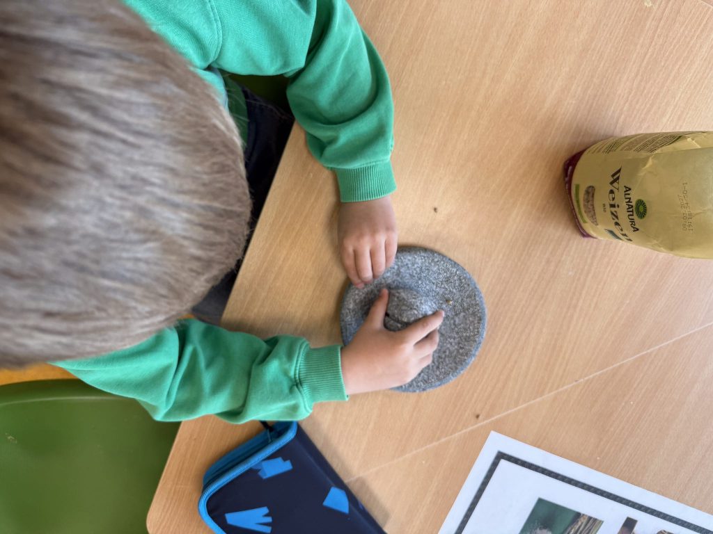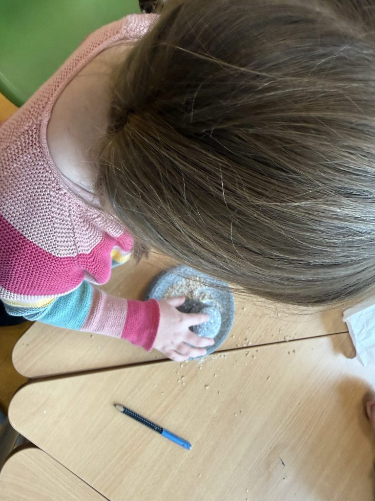 Sie bemalten dabei Steine mit natürlichen Farben, gestalteten Steinzeitschmuck, mahlten Getreide zu Mehl wie echte Steinzeitmenschen und probierten steinzeitliche Kleidung aus, die ihnen ein Gefühl für das Leben ohne moderne Materialien gab. Überall wurde ausprobiert, gelacht, gestaunt und miteinander geforscht.